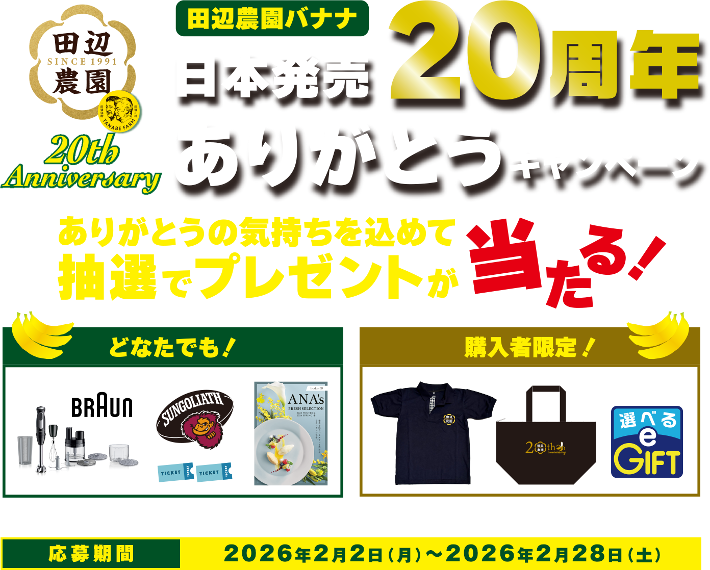 本キャンペーンは応募前です。キャンペーン開始までもう少々お待ちください。 応募期間 2026年2月2日(月)10:00 ~ 2026年2月28日(土)23:59 おかげさまで田辺農園バナナは、日本発売から20周年。 「田辺農園バナナ」とは? 「田辺農園バナナ」は田辺式「バナナ循環農法」により環境と品質に配慮した“園地指定”エクアドル産バナナです。 田辺農園について詳しく知りたい方はこちら!